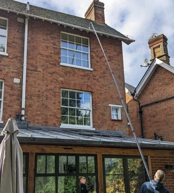 We use a combination of high powered gutter vacuums and ladders to empty your gutters and downpipes. From experience, you can only successfully empty guttering and downpipes using both these methods.